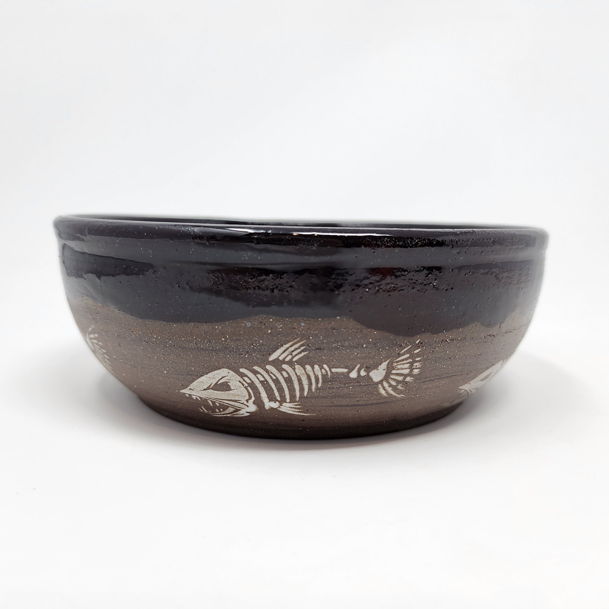 The Fish Bone Bowl with Red Glaze is expertly crafted with an earthy base and delicate white fish bone designs. The Black rimmed glaze adds a pop of mystery, making this bowl a unique addition to your kitchen. Perfect for serving soups, stews, and more, this bowl is a must-have for any home chef.