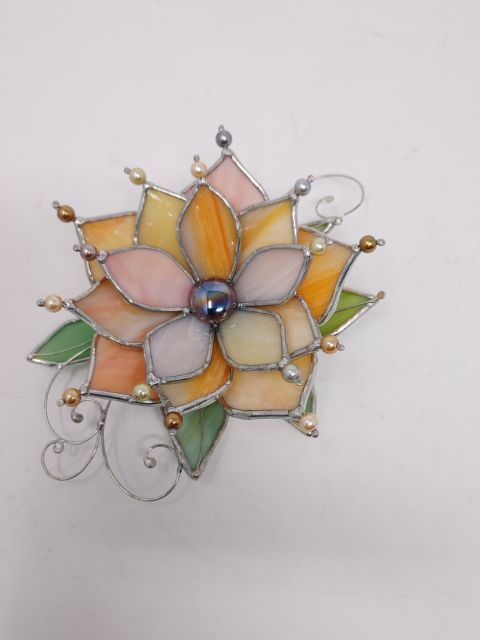 Discover botanical beauty with this enchanting peach lotus ornament, skillfully created by master glass artist Lori Ann Laybourne. The delicate petals are rendered in warm, peachy tones that glow softly when light passes through, evoking the serene grace of an opening flower. Perfect for those who appreciate nature-inspired artistry and refined craftsmanship, this handcrafted piece brings organic elegance to your holiday display. An investment in timeless beauty, this ornament celebrates the intersection of nature and fine art, making it a cherished addition to any collection.